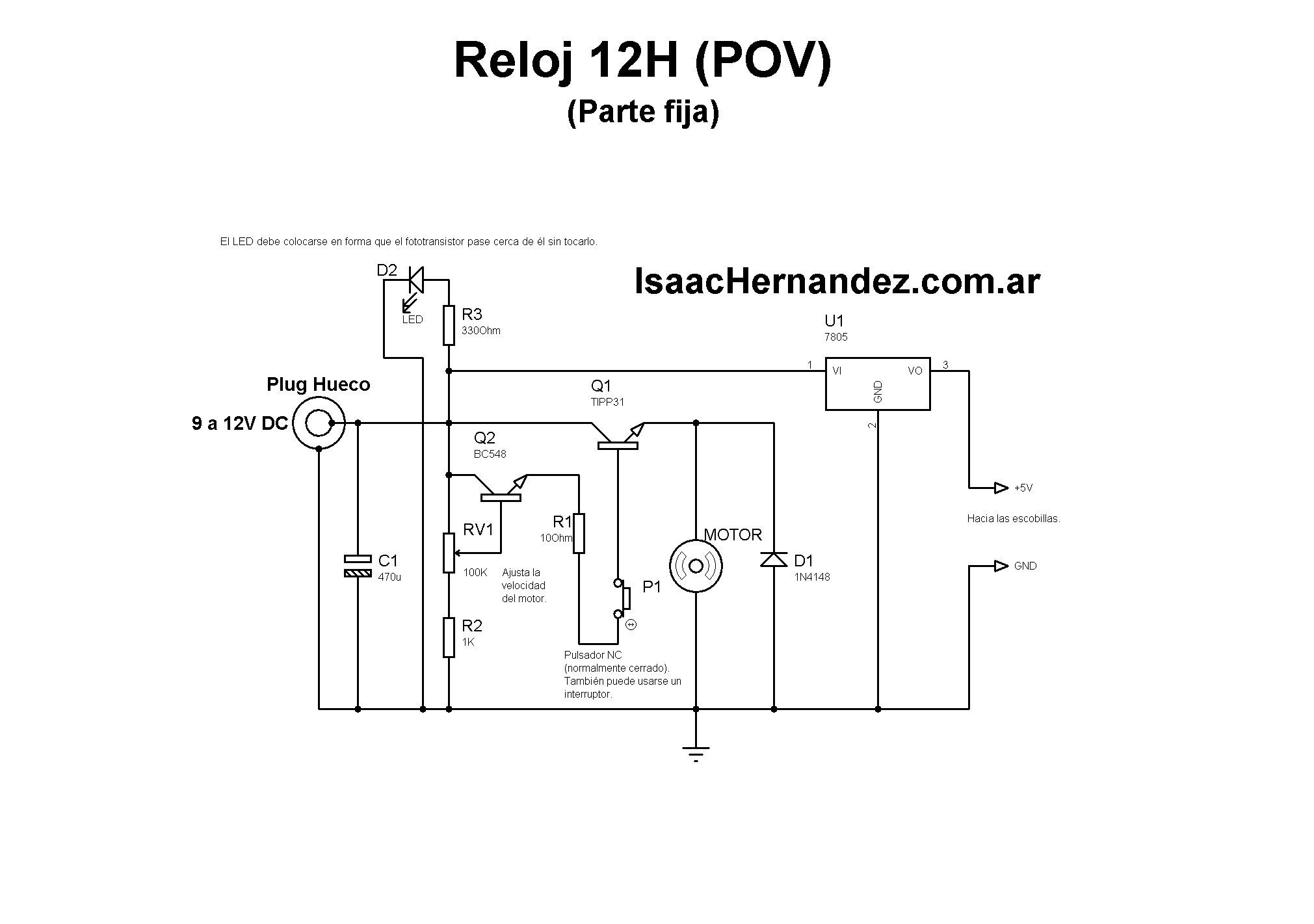 Hay también en esta etapa un potenciómetro P1 encargado de regular la velocidad del motor, mientras más rápido gire se verá mejor la imagen dibujada por los LED’s, sin embargo también mucha velocidad afecta la estabilidad del aparato, por eso también es conveniente además de usar una base pesada y sólida tratar de equilibrar lo mejor posible la parte móvil.