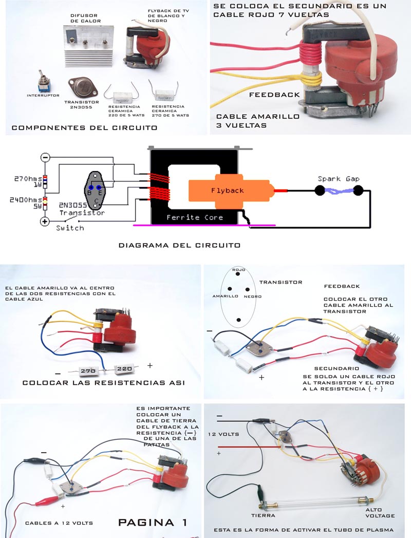 Se necesitan pocos componentes, yo lo armé con un flyback de TV blanco y negro de 12 pulgadas. Hoy día aunque ese tipo de televisores ya no se ve mucho algunas tiendas de electrónica tienen muchos de estos flybacks guardados desde hace mucho tiempo y seguro te venderán uno a bajo precio, hay que saber que mientras más grande sea el televisor mayor es el voltaje que genera el flyback por lo que 10.000 voltios se obtienen con un flyback de tv de 10 pulgadas, pero se puede usar uno de un TV más grande o más pèqueño.