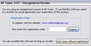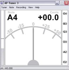 El segundo método que propongo es similar, si no cuentas con el dinero o el tiempo necesario para ir a la tienda a comprar un afinador electrónico, existen programas de computadora gratuitos que hacen el mismo trabajo, yo recomiendo el AP Tuner, el cual es muy sencillo de usar, nada más lo instalas como cualquier otro programa, al abrirlo te pedirá un código de registro pero este es opcional, el programa es gratuito y puedes usarlo todo el tiempo que quieras sin registrar, pulsas en “Use Tuner without registering” y se abrirá la pantalla principal en la cual se ven los mismos datos que nos daría el afinador electrónico, es decir el tono de cada cuerda y una aguja que nos dice qué tan cerca se está de el tono deseado.