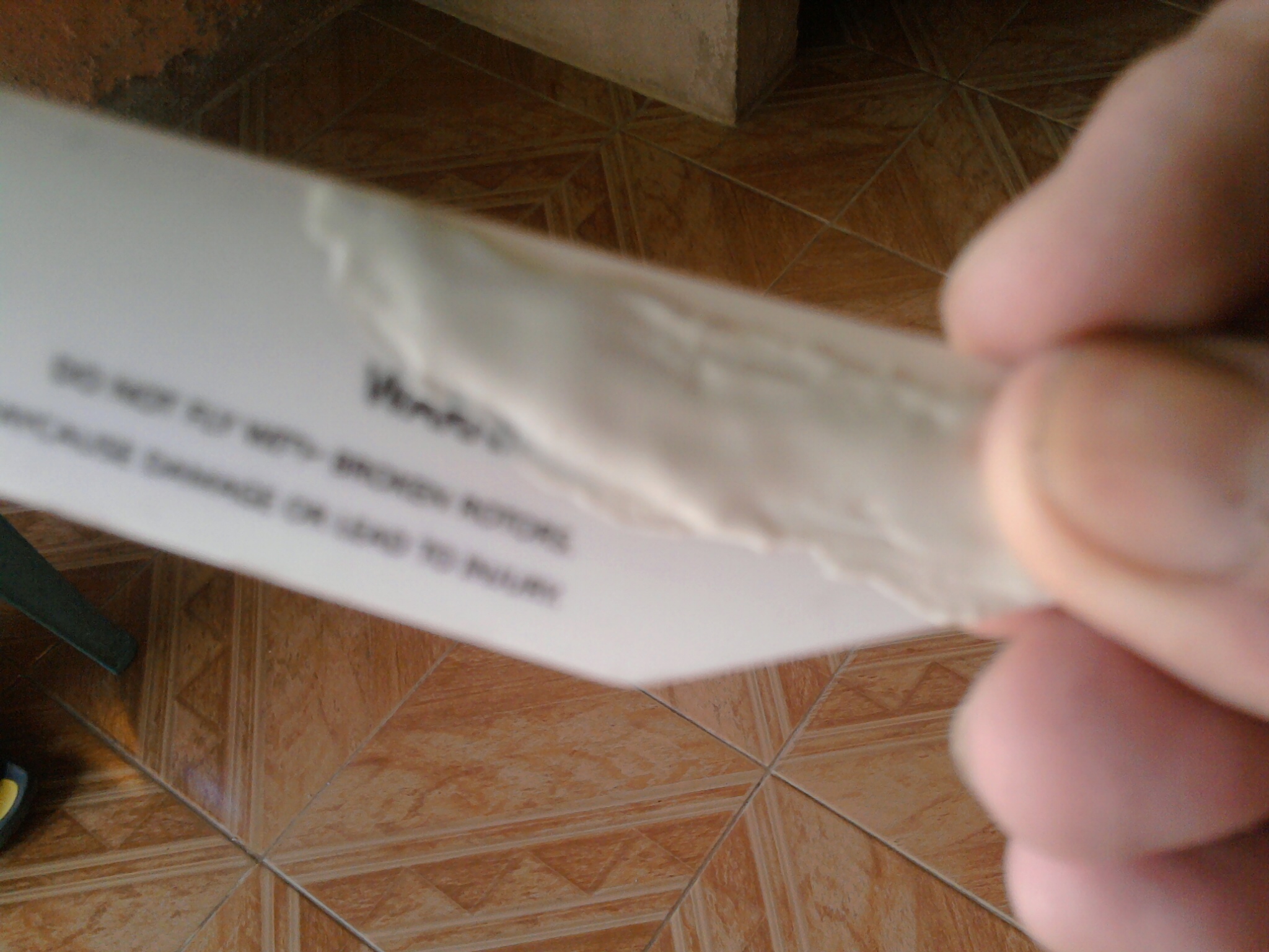 La segunda falla fue más grabe, se rompió una de las aspas al golpear contra un obstáculo. Luego de pensar un poco decidí que la mejor forma de repararla era con pegamento 2 toneladas, por lo que procedí a hacer la mezcla y aplicarla al aspa rota, y unas cuatro o cinco horas después ya estaba suficientemente fuerte para seguir volando.