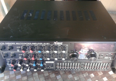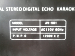 El que vamos a ver hoy es uno de marca XHF modelo AV-901 tal como lo dice en su parte trasera, además de esto podemos ver entre las especificaciones la inscripción 1200W x 2 (p.m.p.o). P.M.P.O es una medida de la potencia en valores pico, sin embargo la potencia real del aparato medida en RMS es mucho más baja, cabe mencionar también que muchas veces estos amplificadores no indican ningún modelo ni sus características, no obstante sin importar la marca o modelo que se trate la mayoría usan circuitos muy parecidos.