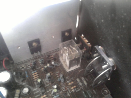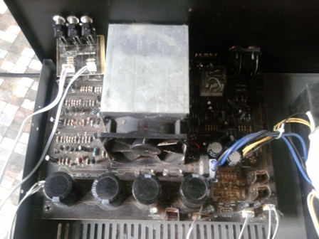 Como mencioné anteriormente la mayoría de estos aparatos usan circuitos muy parecidos, por lo general es un amplificador estéreo con cuatro transistores bipolares (dos por canal). Lo que varía más de modelo a modelo son los circuitos de pre-amplificación y ecualización pues cada modelo trae algunos tipos de entrada o controles que otros no. En las fotos siguientes podemos ver la placa principal del amplificador, justo en el medio de ella hay un disipador de calor al que están atornillados los cuatro transistores de potencia, y que es enfriado por un extractor de aire de 12 voltios.